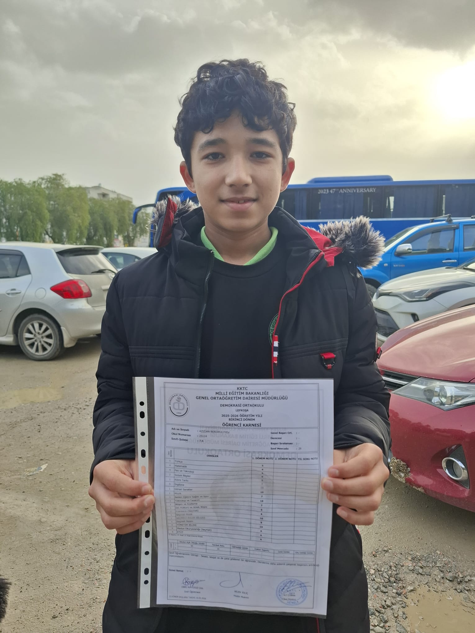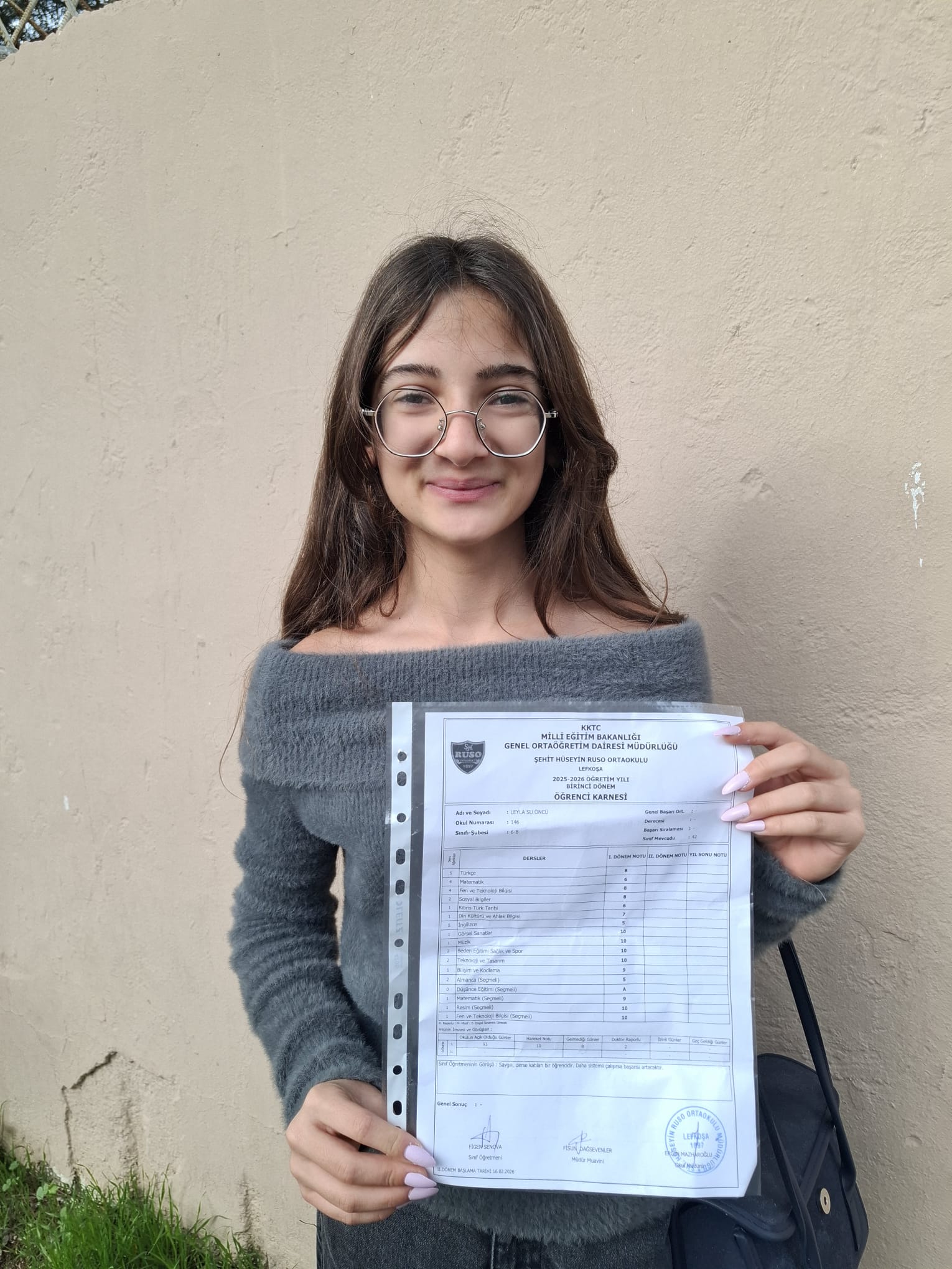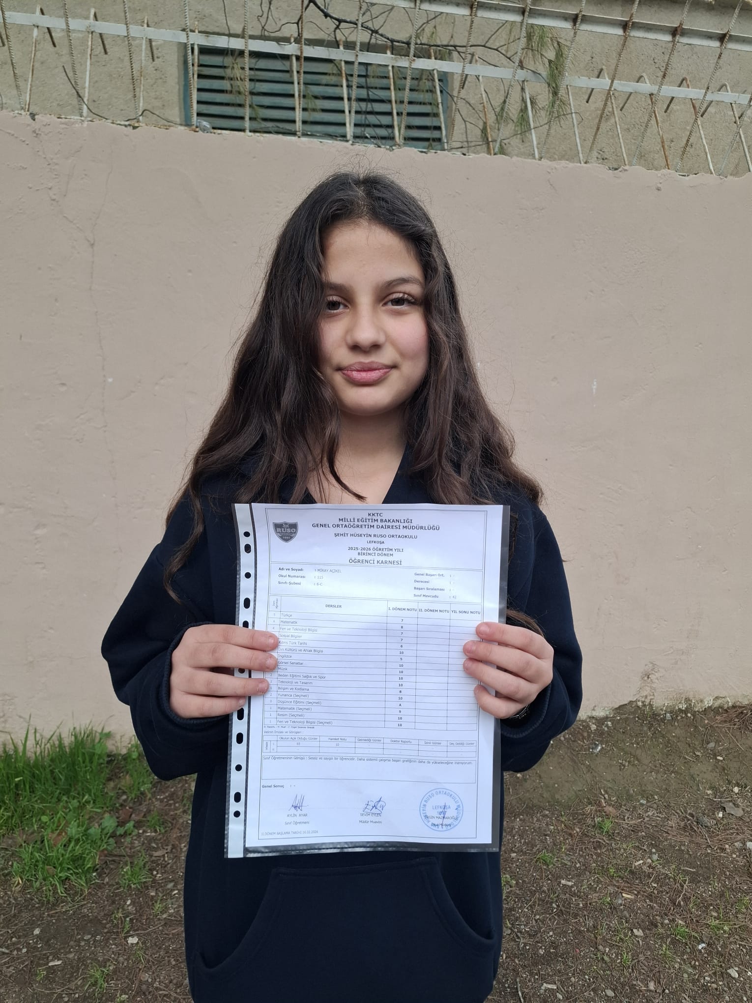 “Şehit Hüseyin Ruso Ortaokulu’na gidiyorum 6. Sınıfım. En düşük notum 8 o da Türkçe. Tatil olduğu için çok mutlu değilim, okul eğlenceliydi. Dersler de iyiydi ama çok iyi öğretenler yoktu. Derslerin biraz daha eğlenceli olmasını isterdim. Tatilde gezeceğim. Karnede dikkatimi çeken bir şey oldu; Türkiye’de karnelerde Atatürk resmi yok ama Kıbrıs’ta var. Saygı duyulmasını tercih ederim.”