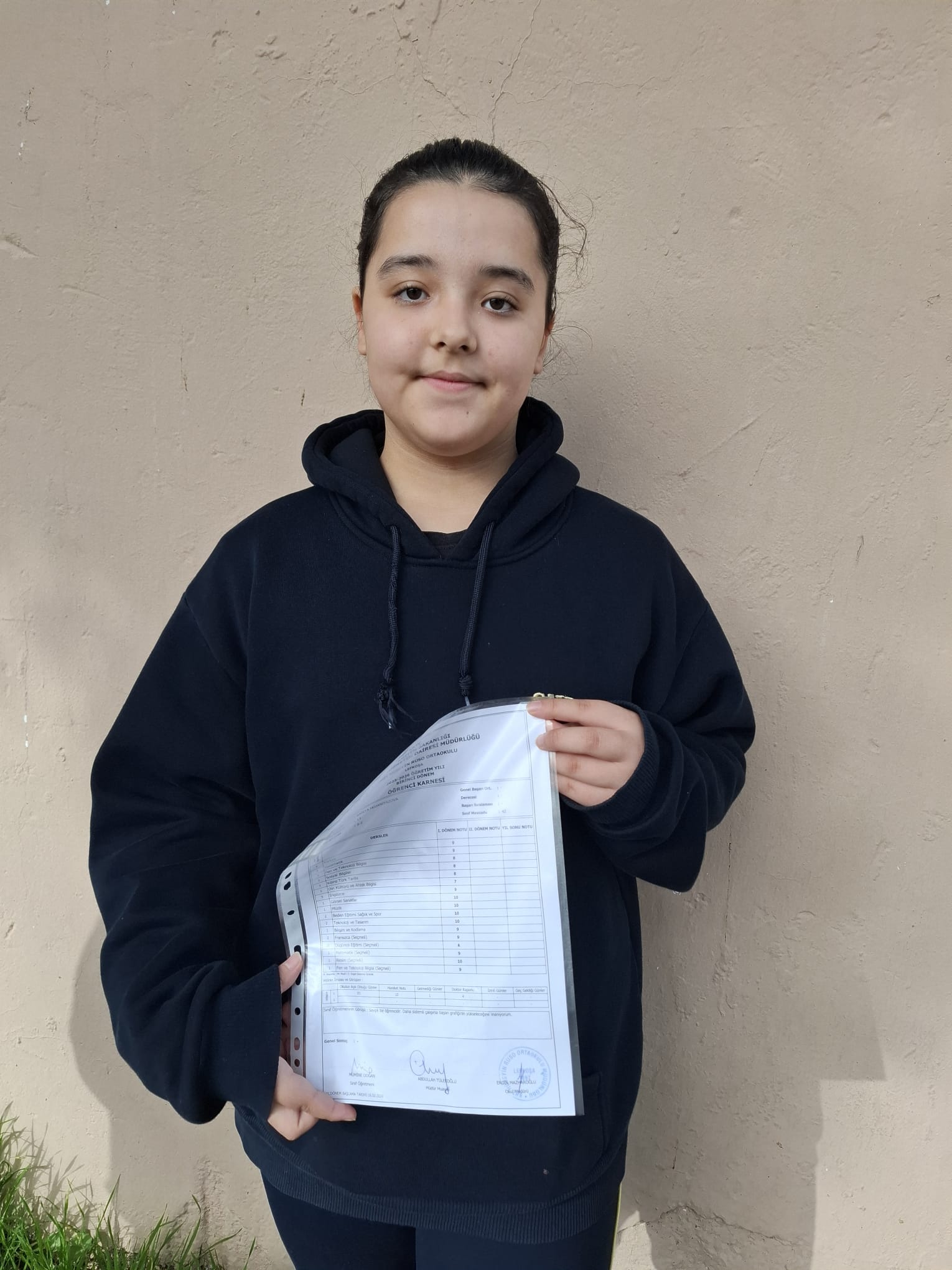 “Şehit Hüseyin Ruso Ortaokulu’nda 6.Sınıfa gidiyorum. Karnem açıkçası beklediğimden yüksek geldi. Çok da çalıştığım söylenemez ama sınavlardan da yüksek aldım. Çalışmadan yüksek almak biraz şansa giriyor galiba. Ders notlarımın yarısından fazlası 10, en düşük ders notum 5; o da İngilizce ve Almanca. İkinci dönem bu derslere daha çok çalışmayı düşünüyorum. Ara tatilde Almanca İngilizce kitaplar okumaya, kelimeler öğrenmeye çalışacağım.”
