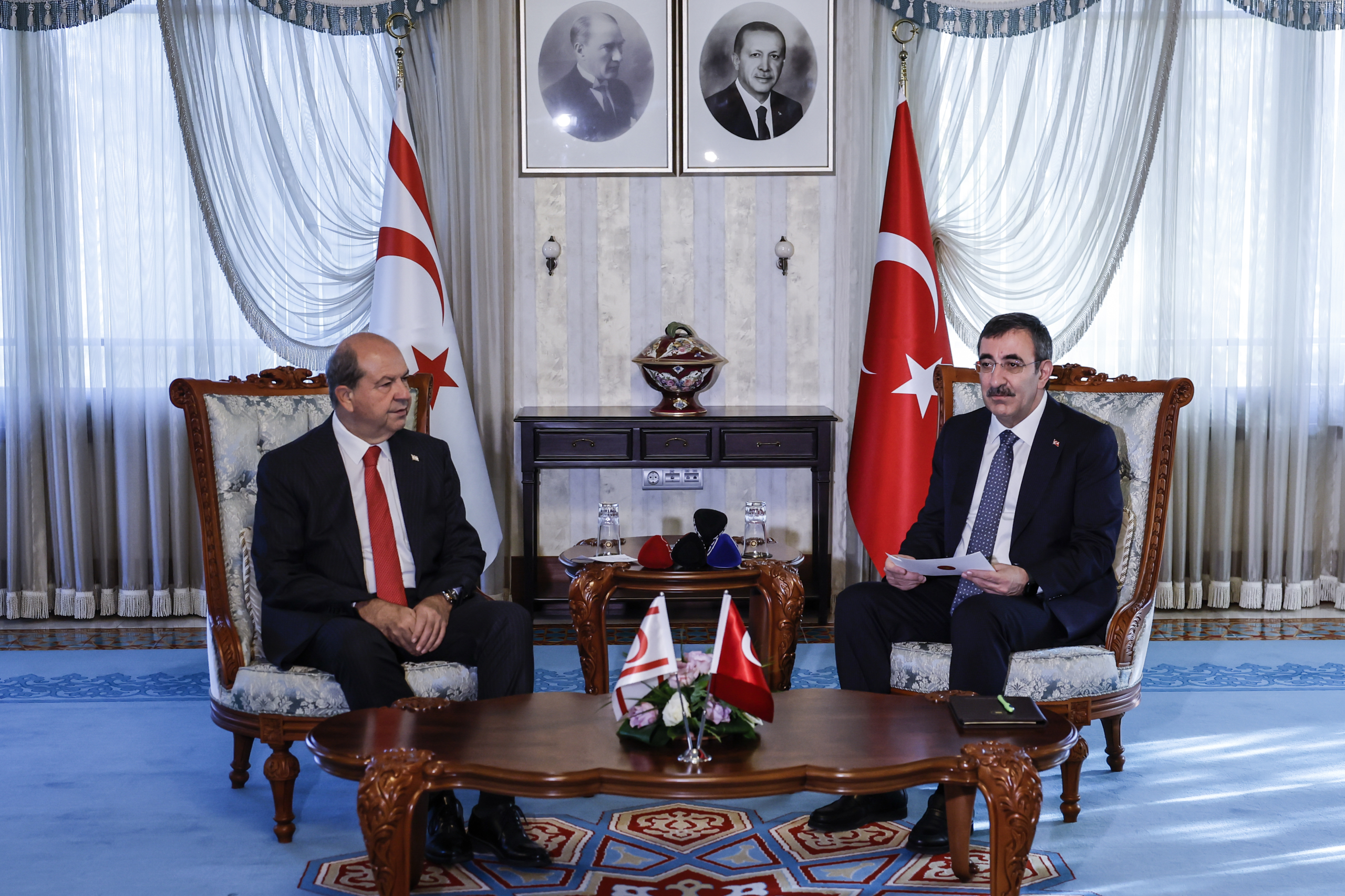 Cumhurbaşkanı Yardımcısı Cevdet Yılmaz (sağda), KKTC Cumhurbaşkanı Ersin Tatar (solda) ile Cumhurbaşkanı Yardımcılığı Konutu’ndaki baş başa görüşme öncesinde Tatar ile ortak basın açıklaması yaptı. ( Arman Önal – Anadolu Ajansı )